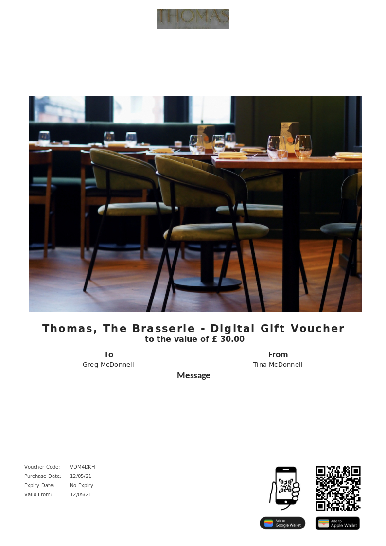 Buy a Thomas, The Brasserie gift card for a present amount (£50 minimum) for that special occasion to be delivered on their special day.
